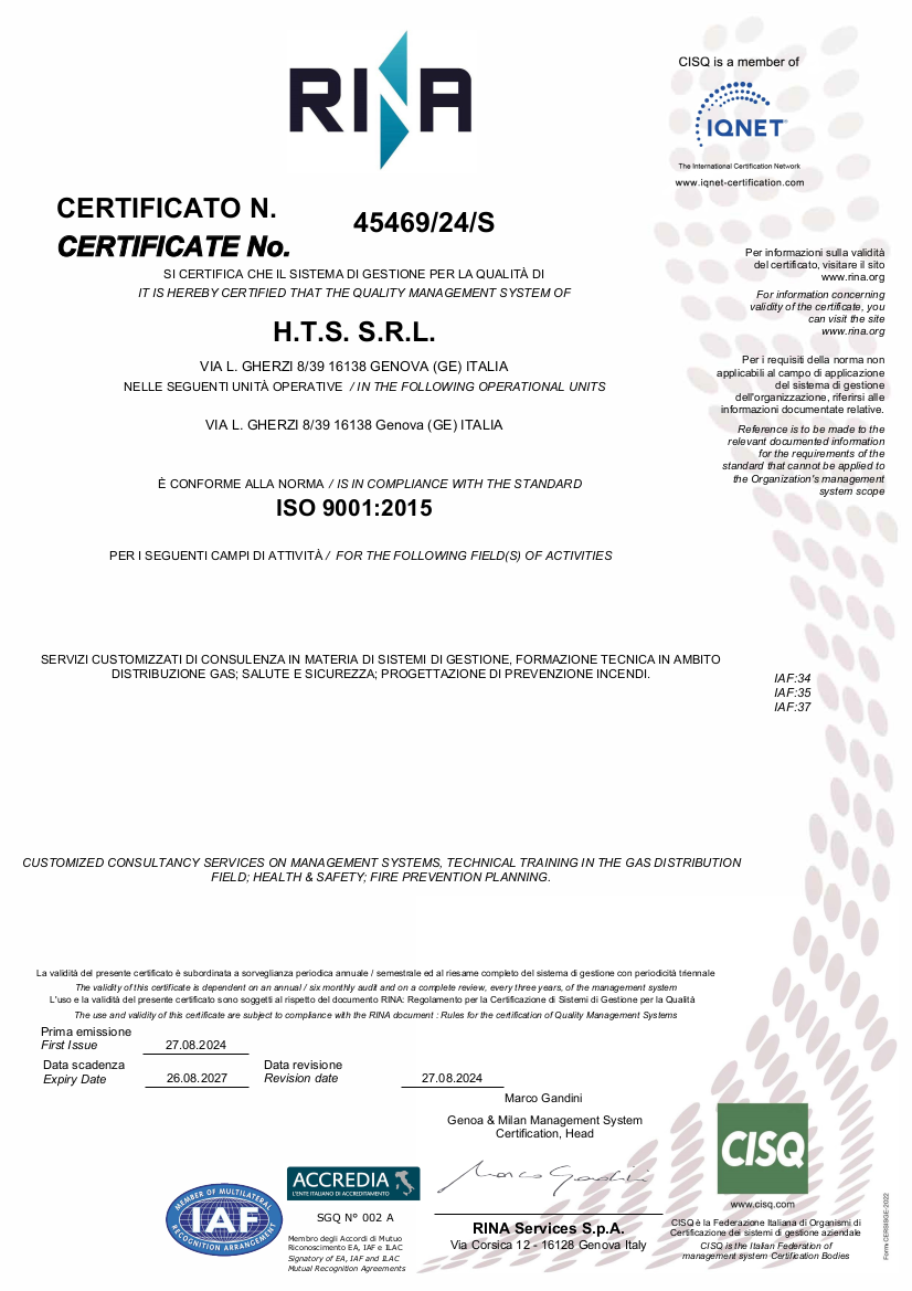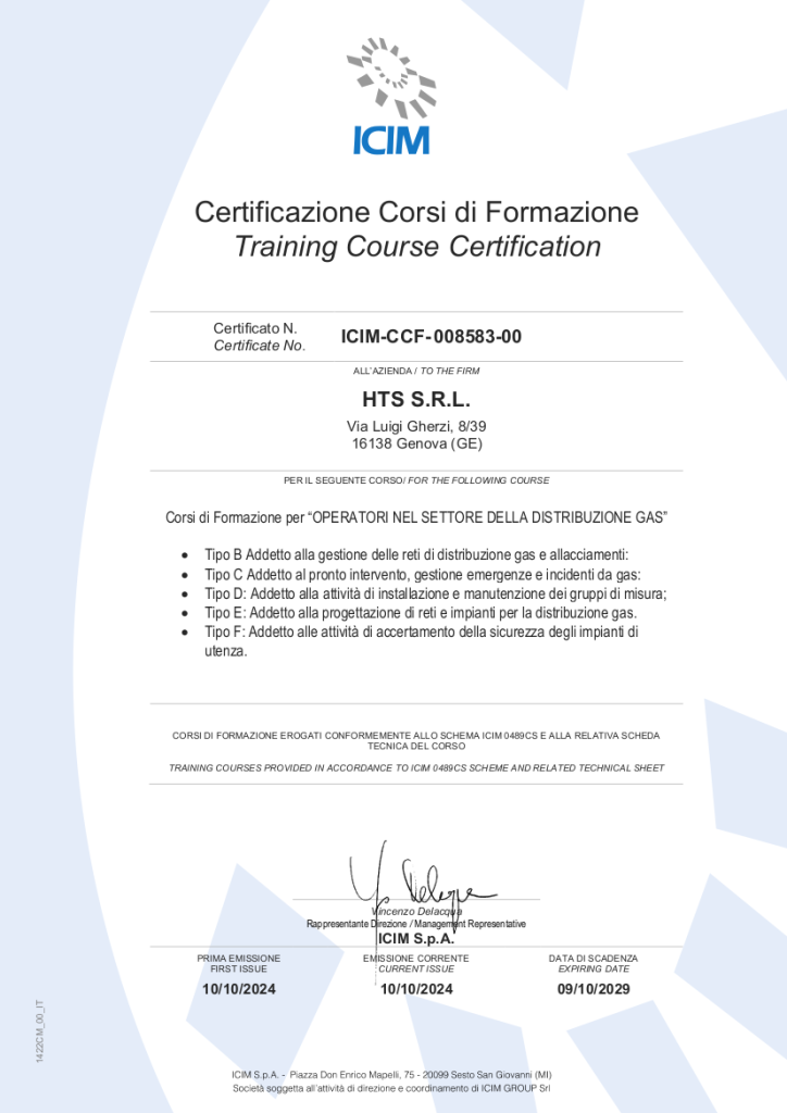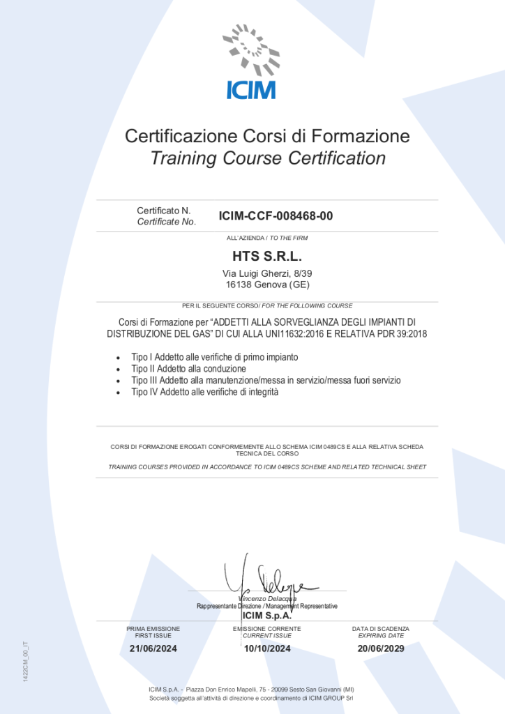 HTS s.r.l. al fine di un continuo miglioramento e darvi ancora maggiori garanzie sulla qualifica della propria formazione ha certificato i contenuti dei propri corsi di tecnica gasistica rispetto allo schema ICIM 0489CS_00_IT_Schema qualifica corsi di formazione relativi alle figure professionali.